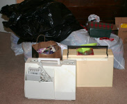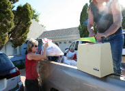 Generous donations from Jo Riffle and the Thimbleberry Quilt club are collected.